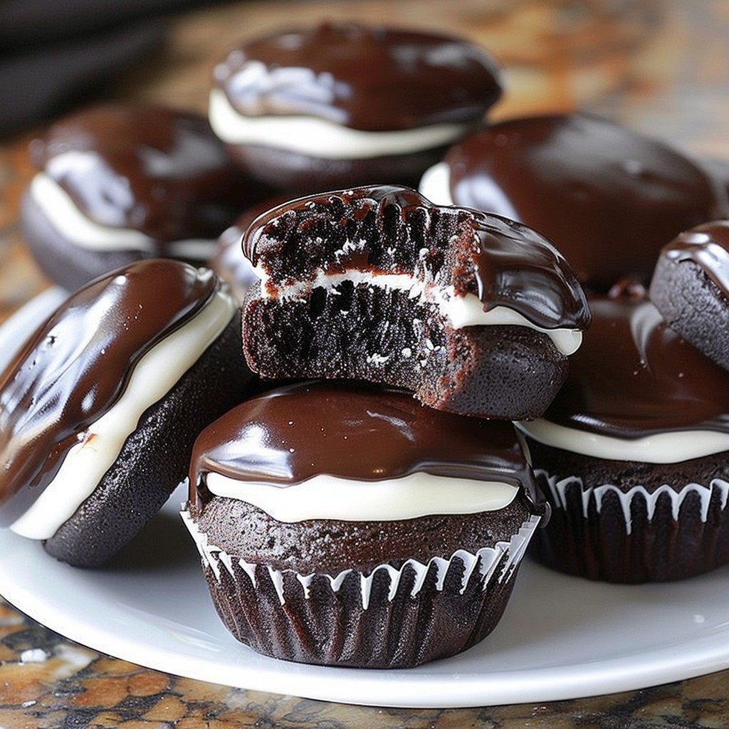 Podaruj sobie nostalgiczną rozkosz w postaci babeczek Homemade Hostess Cupcakes, w których znajdziesz wilgotne ciasto czekoladowe wypełnione kremowym puchem marshmallow i zwieńczone bogatym czekoladowym ganache. Te dekadenckie smakołyki są idealne, aby zaspokoić ochotę na słodycze i przywrócić wspomnienia z dzieciństwa.