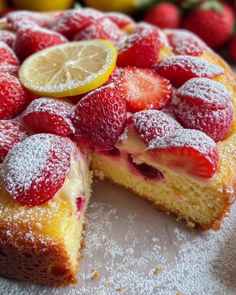 Składniki: – 250 g mąki – 200 g cukru – 150 g jogurtu naturalnego – 60 g oleju z pestek – 350 g truskawek – 2 jajka – 8 g
