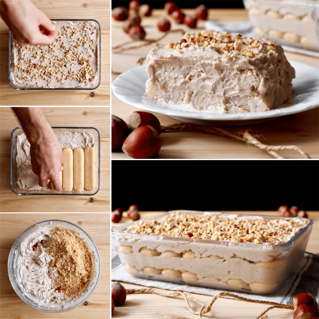 Brykiet z orzechów laskowych Składniki Dawki dla 6 osób 250 g mascarpone 300 ml świeżej śmietany 100 g cukru pudru 100 g prażonych orzechów laskowych 15 g Nutelli® 1 łyżka