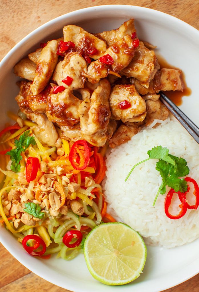 Kurczak po wietnamsku to kawałki filetu z piersi kurczaka, w azjatyckim sosie z imbirem, chili i limonką. Z dodatków polecam ryż jaśminowy oraz sałatkę z mango. Składniki 2 porcje 400