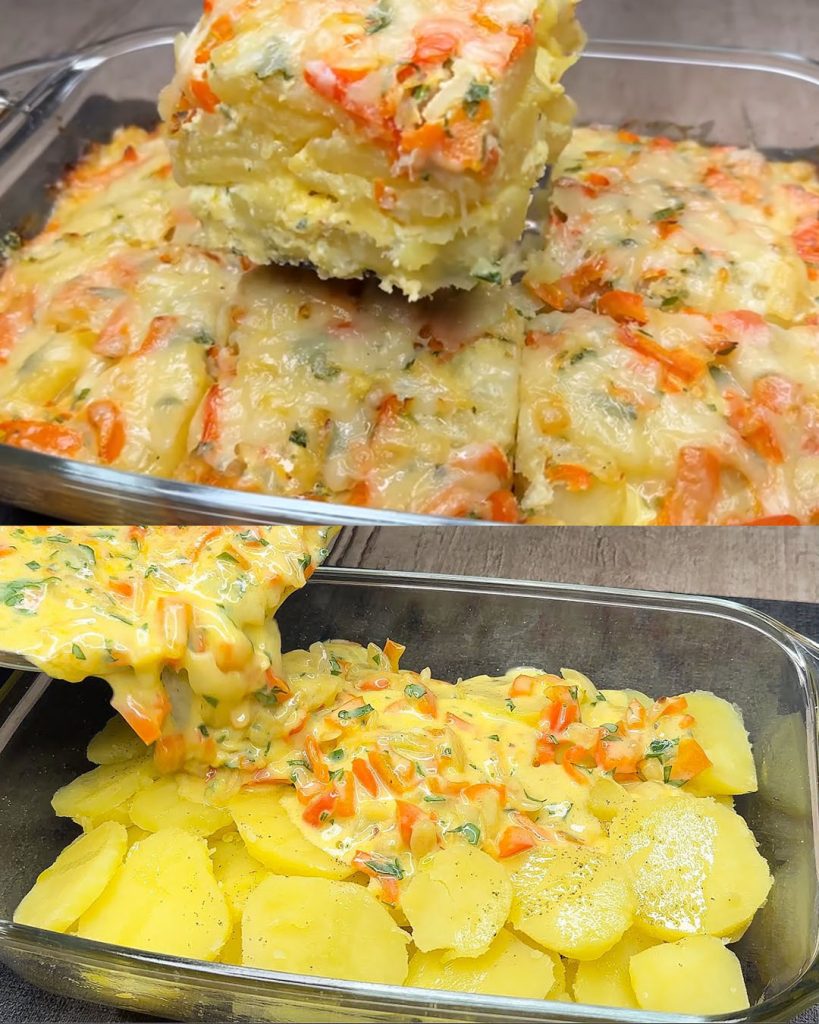 Szybki i łatwy placek ziemniaczano-serowy Składniki: 1 kg (2 funty i 4 uncje) ziemniaków, pokrojonych w cienkie plasterki 1 cebula, drobno posiekana 1 ząbek czosnku, posiekany 1 słodka papryka, pokrojona
