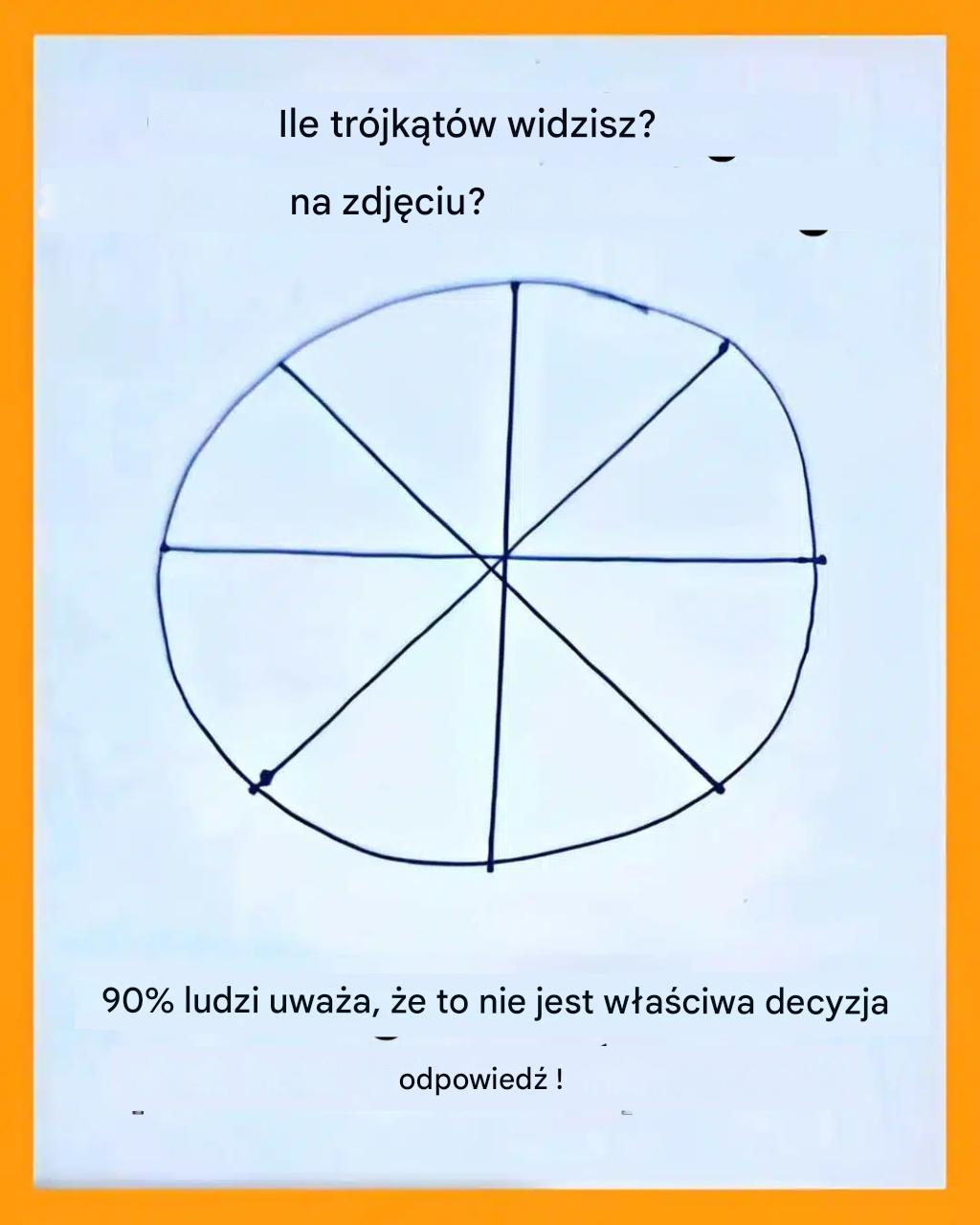 Wygląda jak symetrycznie pokrojony tort. Koło, cztery proste linie przecinające się w środku i proste, odręcznie napisane pytanie: „Ile trójkątów?”. „Łatwe, prawda? A jednak… Ta mała wizualna łamigłówka, która krąży po sieciach z zawrotną prędkością, stanowi wyzwanie nawet dla najbardziej spostrzegawczych umysłów. Więc, czy jesteś gotowy podjąć wyzwanie?