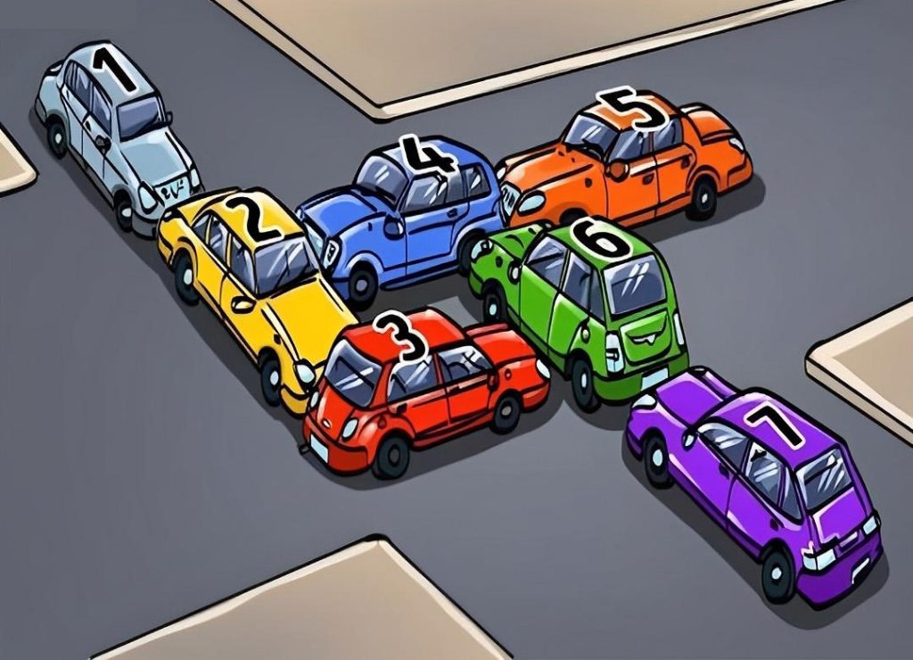 Na zdjęciu (wyobraźmy sobie to przed sobą) 7 samochodów sieje prawdziwy chaos. Od Ciebie zależy znalezienie rozwiązania problemu: wystarczy przesunąć jeden samochód, a wszystko stanie się jasne.