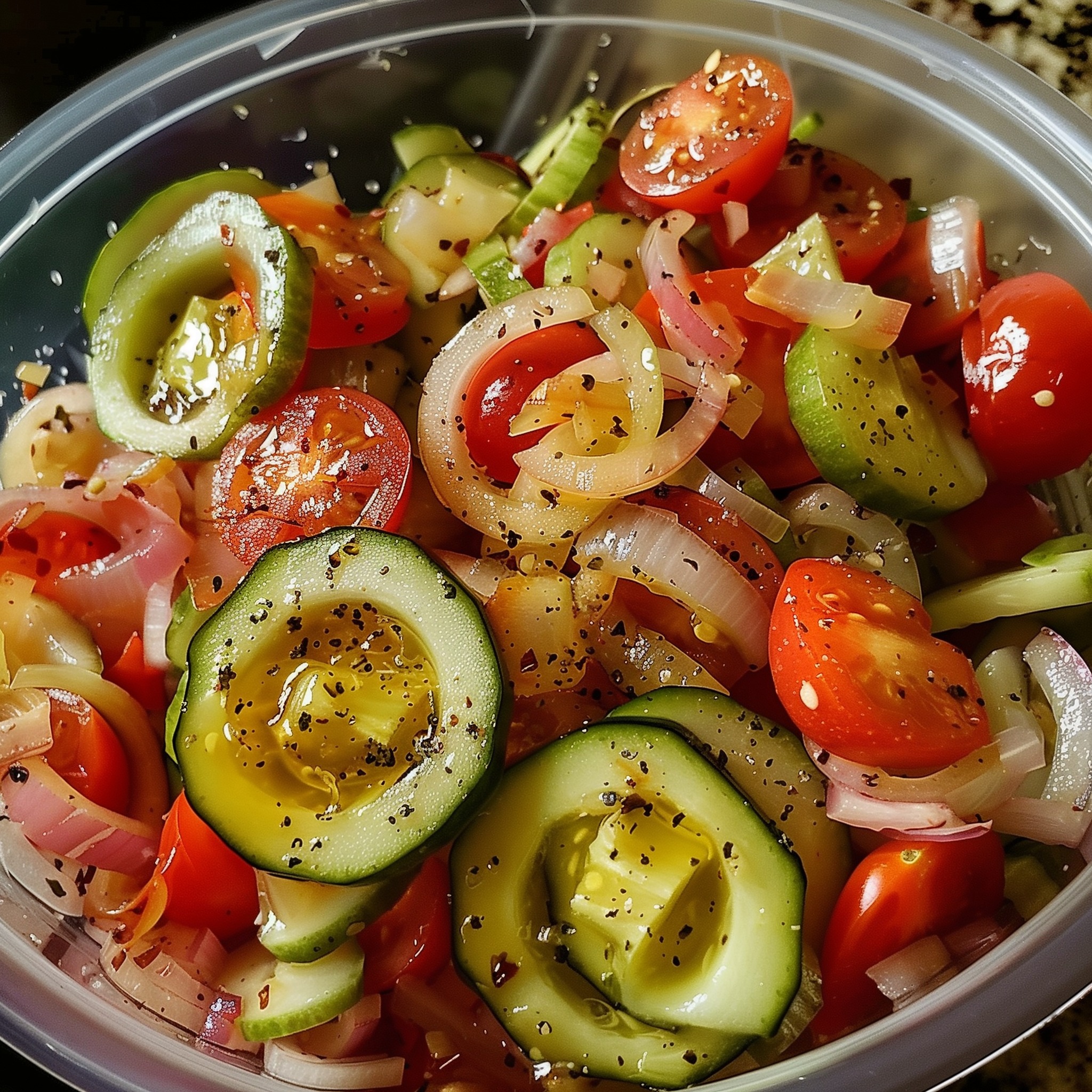 Ogórki, Cebula i Marynowane Pomidory, pyszna, lekka i orzeźwiająca sałatka, idealna zarówno na lato, jak i zimę. W tym przepisie podoba mi się to, że można go podawać z kurczakiem lub dowolnym daniem głównym!