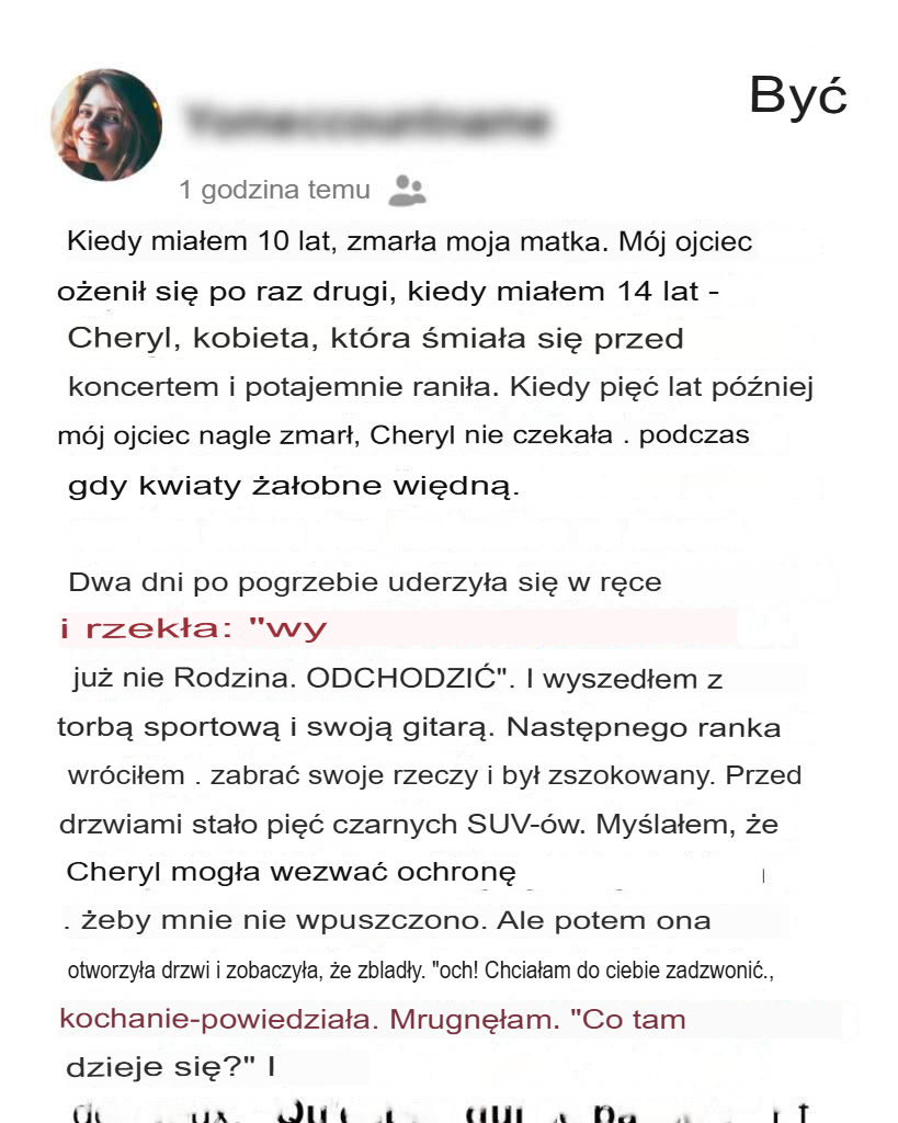 Cheryl przybyła, gdy miałem 14 lat. Używała perfum, które sprawiały, że bolała mnie głowa, i uśmiechu, który nigdy nie docierał do jej oczu, gdy tam byłem. Tata uważał ją za ciepłą i promienną. I szczerze mówiąc, dała mu doskonały występ.