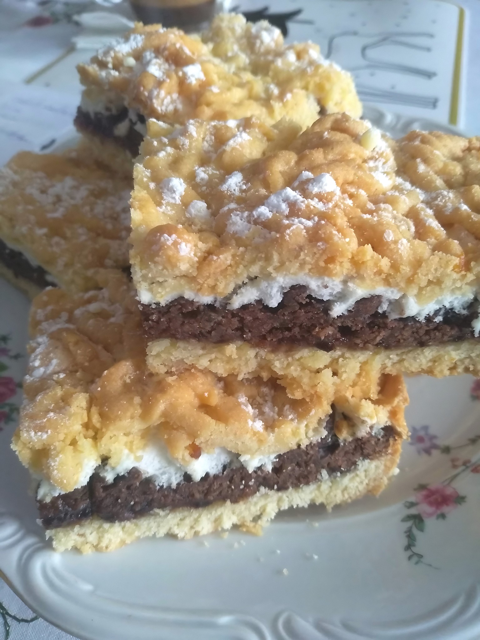 - 🧁 Ubij białka z 3 łyżkami cukru, dodaj 1 łyżkę mąki ziemniaczanej i wyłóż na ciemne ciasto.