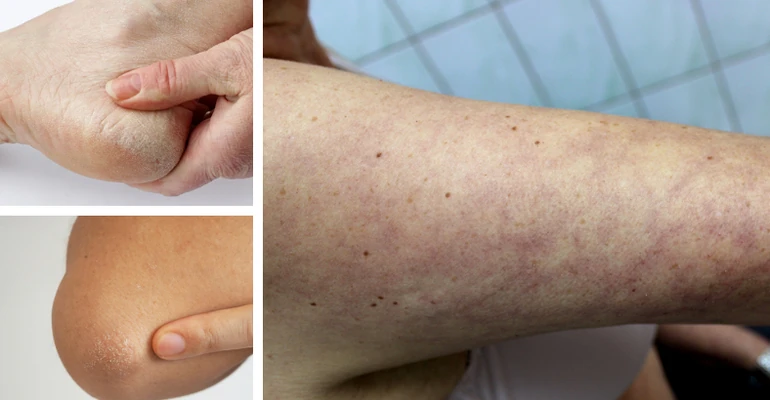 • 👣 **Rogowacenie pięt i skóry na łokciach** – nadmierna suchość.