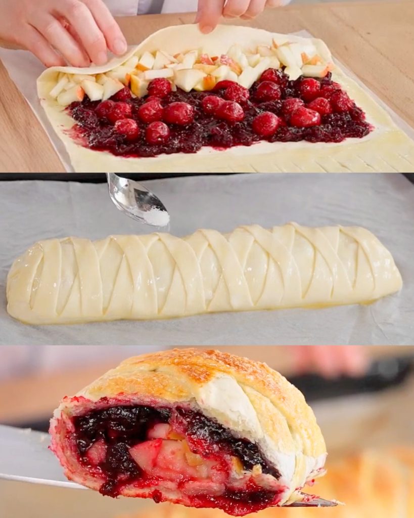 Składniki: 250 g ciasta francuskiego 200 g mrożonych jagód 1 łyżka cukru 2 łyżeczki cukru 1,5 łyżeczki skrobi kukurydzianej 1 jabłko Cukier waniliowy 1 jajko Wskazówki:
