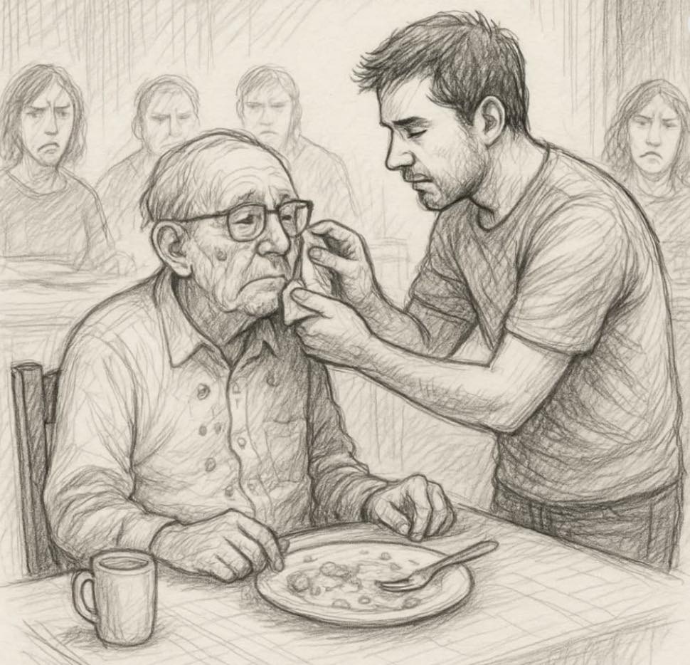 Delikatnie pomógł ojcu wstać, odprowadził go do łazienki, delikatnie umył mu twarz, usunął plamy z ubrania, poprawił siwe włosy i delikatnie poprawił okulary.