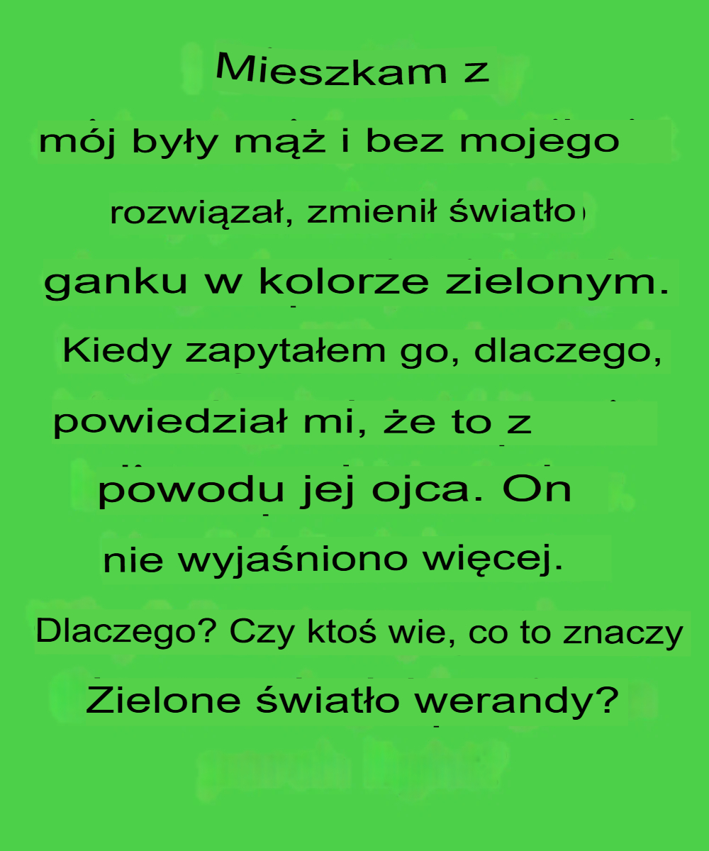 Mieszkam z moim byłym mężem i bez mojej zgody zmienił światło na ganku na zielone. Kiedy zapytałam go dlaczego, powiedział, że to z powodu jego ojca, który niedawno zmarł. Nie rozwinął tematu. Dlaczego? Co oznacza zielone światło na ganku?