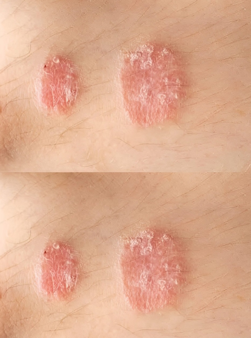W zależności od naturalnej pigmentacji, zmiany mogą wykazywać zmiany chromatyczne i powodować resztkową pozapalną hiperpigmentację.