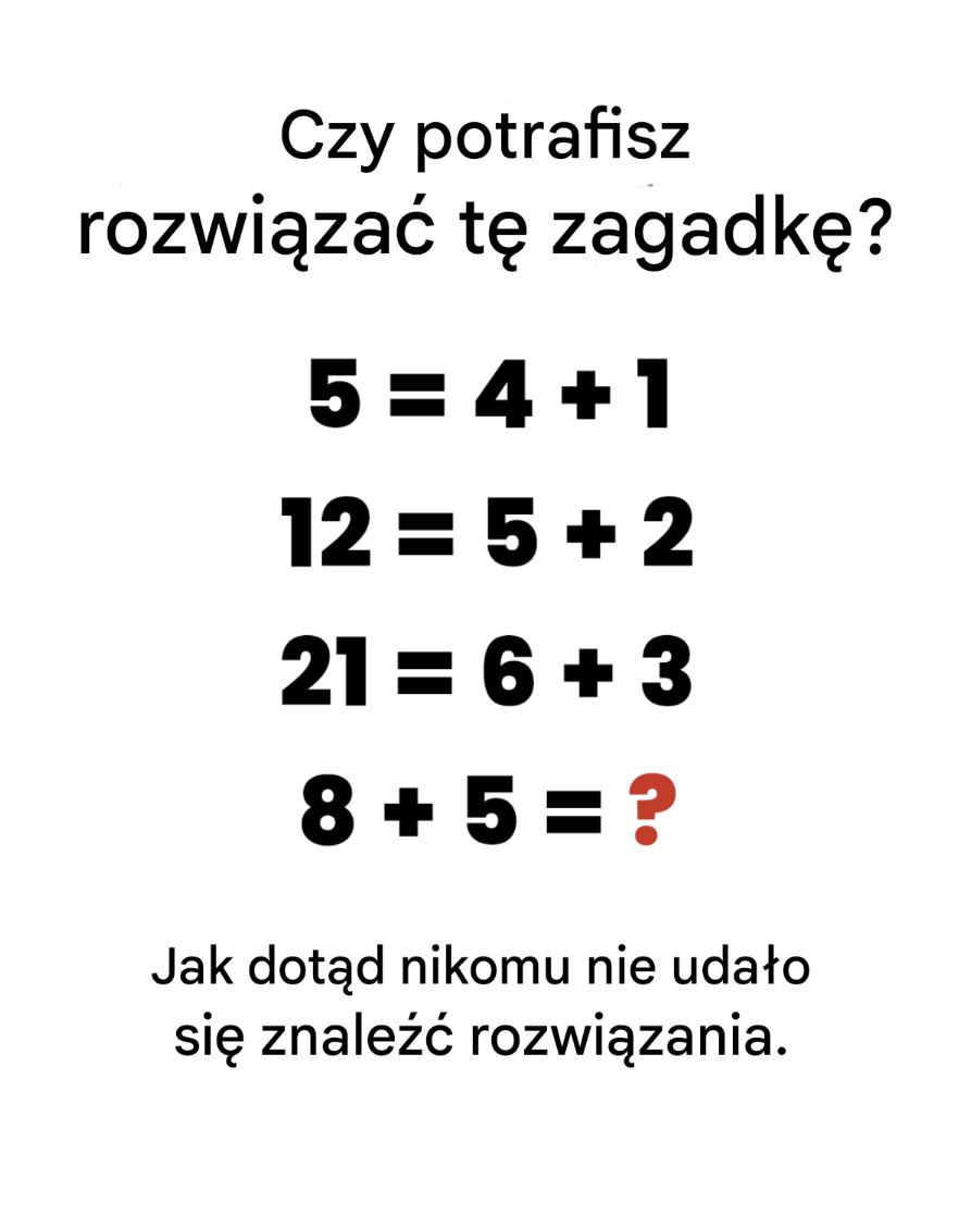 Dobrze przeczytałeś. Prosta łamigłówka z dodawaniem rozbudza ciekawość w internecie. Wydaje się dziecinna… dopóki nie spróbujesz jej rozwiązać. Dlaczego? Bo tutaj 1 + 4 to 5, ale 2 + 5 to 12, a 3 + 6 to… 21! Ile więc wynosi 5 + 8? Przygotuj się na spojrzenie na matematykę inaczej!
